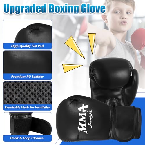 6oz Kids Boxing Gloves: Punching bag boxing gloves for kids are made of extra thick foam cushion and wear-resistant pu leather, hook and loop closure design. Thickened cushioning and breathable mesh, absorb impacts & providing comfort, comfortable to wear and safe not to hurt your child’s hand