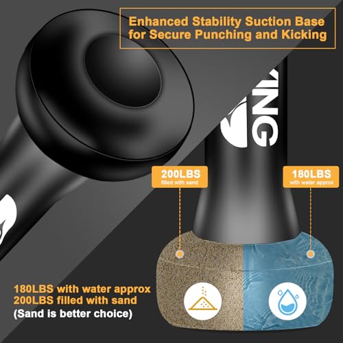 Stable Large Base Boxing Equipment: The thickened 0.5 MM PVC base effortlessly supports up to 80 kilograms of weight, capable of holding 180 pounds of water or 200 pounds of sand; Before using this heavy bag, be sure to fill the base with water/sand and then inflate it using the air pump; You can use either material or a combination of both to ensure stability; Sand is the preferred choice for added stability